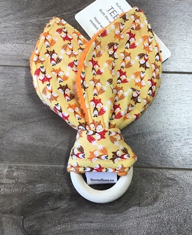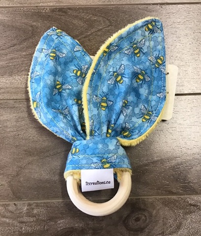Bunny Ears crinkle and are wrapped around a safe wooden teething ring. Hand wash only and do not allow wooden teething ring to sit in water. The bunny ears can be removed from the teething ring and machine washed and dried. If you need instructions for attaching ears to teething ring after washing, message me.